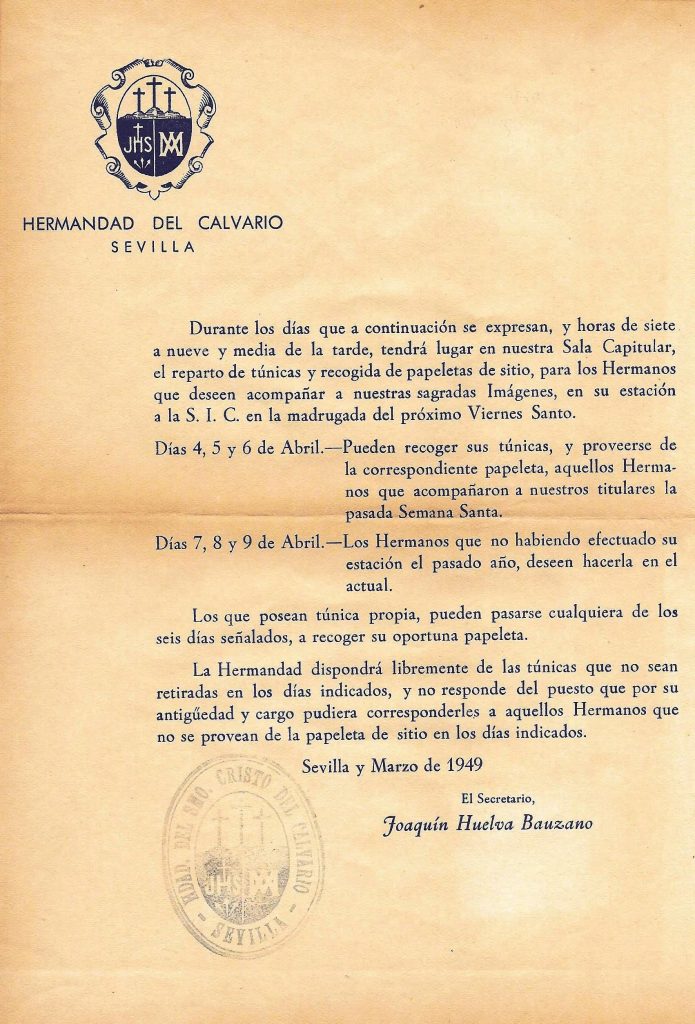 Se trata de un sobre de la Hermandad dirigido a N.H.D. Rafael Blas Rodríguez, destacado pintor y restaurador, que contiene una circular con la información sobre el reparto de papeletas de sitio para la Semana Santa del año 1949, así como la convocatoria para el solemne Traslado del Cristo al paso para la estación penitencial de ese mismo año. Es éste el testimonio documental más antiguo que se conserva sobre dicho acto de culto, puesto que se trata de una de las primeras ocasiones en que se celebró el Traslado, que empezó a organizarse en 1944. Además este año era especial, ya que fue la primera vez que se ubicaron los pasos en el coro bajo parroquial, y por tanto lejos de la capilla, por lo que debió conformarse el Traslado de manera harto similar a cómo se verificó hasta finales de los años setenta.